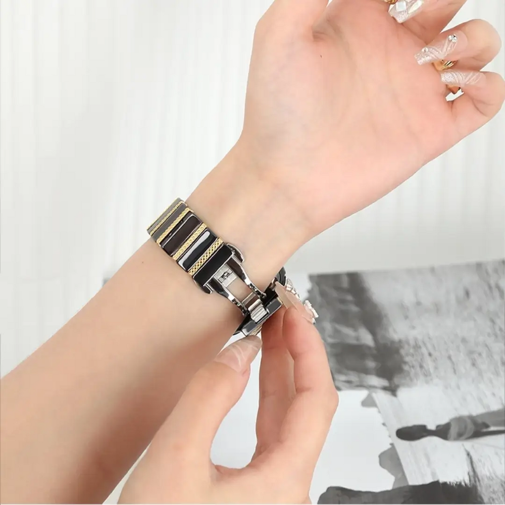The scratch-resistant ceramic links are cool to the touch and hypoallergenic—making them ideal for sensitive skin and all-day wear. Choose from three stunning colorways—White & Silver, Black & Silver, and Black & Gold—each designed to complement both casual looks and formal attire.