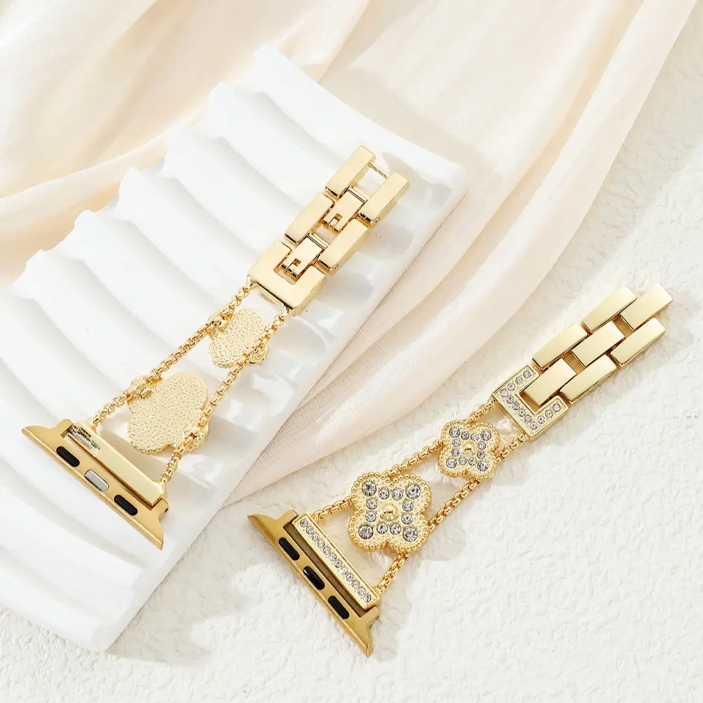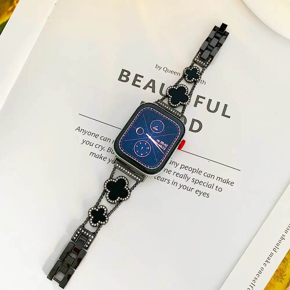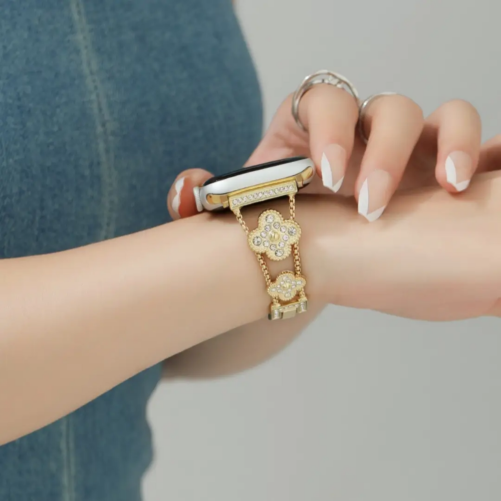 ✨ The Lucky Clover Diamond Apple Watch Band blends luxury design with everyday elegance. Featuring sparkling crystal clovers and a refined stainless steel finish, it adds a sophisticated touch to your wrist.